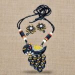Embrace the beauty of traditional craftsmanship with this exquisite terracotta jewelry set. Featuring a centerpiece peacock pendant with intricate hand-painted details in black, gold, and white, this set is a true celebration of ethnic artistry. The necklace is complemented by matching floral-themed earrings, making it a perfect statement piece for any occasion.